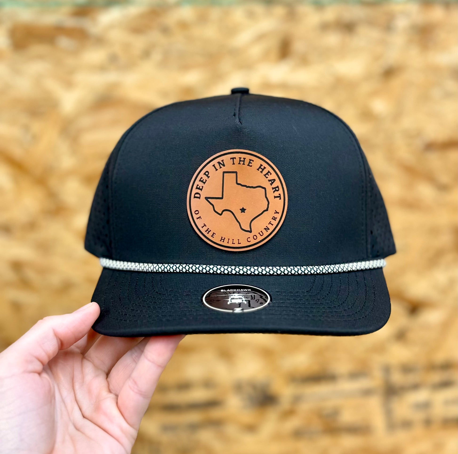 Show your support for the Texas Hill Country with this classic black rope hat, proudly featuring a premium engraved leather patch. Built for comfort and style, this structured snapback honors the strength and resilience of the communities affected by recent floods. Every purchase helps raise funds for families rebuilding their lives. There is nothing else quite like being "Deep In The Heart Of The Hill Country."